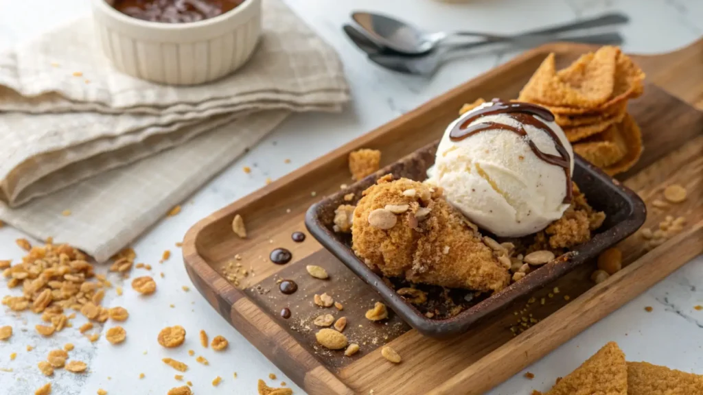 You’ll need vanilla ice cream, chocolate sticks, and cornflakes for the coating. For detailed instructions, check out our Fried Chicken Ice Cream Recipe.