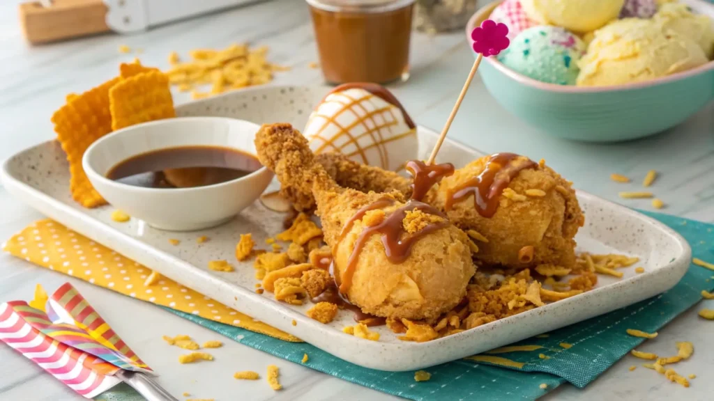 If you’ve ever seen fried chicken ice cream online or at a trendy dessert shop, you probably did a double take. Yes, it looks like a crispy piece of fried chicken, but it’s entirely a dessert! This whimsical treat combines creamy vanilla ice cream, white chocolate, and crushed cornflakes to create the perfect illusion of fried chicken.